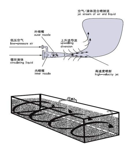 整个系统主要由喷射式曝气器,循环水泵及鼓风机所组成。该曝气装置将由循环水泵所压送之液体,经由液体管、内喷嘴到喷嘴混合室与由空气管所压送之空气混合均匀后,呈喷射流经外喷嘴水平射出。为达循环水与空气之均匀供应与混合,以提高曝气效率,因次特别设计液体管与空气管分开,而且每一空气支管单独与每一组喷嘴配合连接。喷射式曝气装置之作用原理如下图: